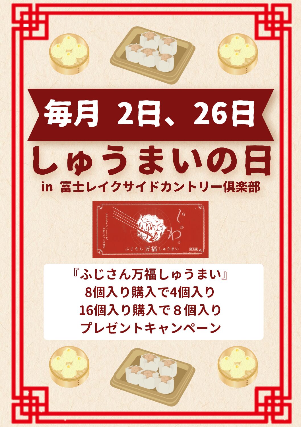 富士レイクサイドはその日がクローズ期間中となるため、毎月2日と26日をしゅうまいの日としてプレゼントキャンペーンをします!